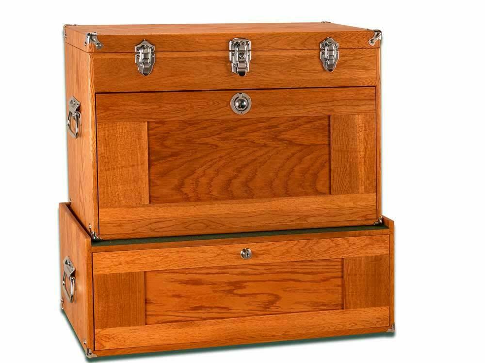 Chrome plated steel hardware is hefty and durable and adds style to the chest while the side handles allow for portability even when loaded with your favorite items. This "Large-Base" will protect your favorite tools from rust and moisture. The sturdy tongue and groove joinery highlights the beauty of hardwood construction and the quality of workmanship.