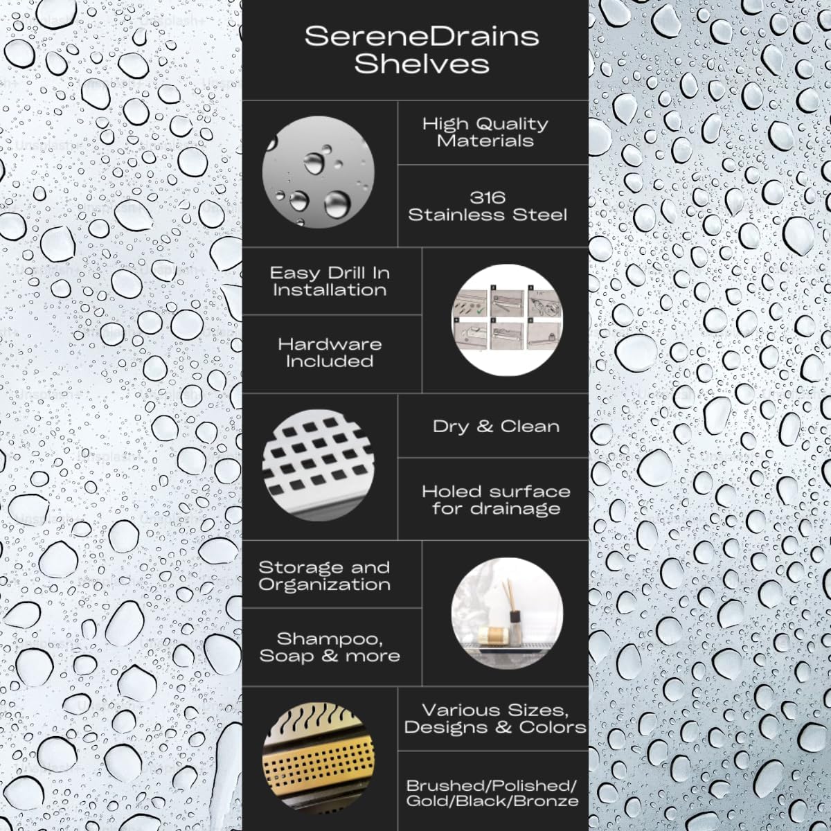 Remodel your bathroom with SereneDrains Stainless Steel Shower Shelf, designed to organize shampoo, conditioner, and other essentials. These rust-proof shelves are built for durability in humid environments, offering both functionality and elegance. Whether you need a sleek metal shower shelf or corner shower caddy, these high-quality solutions maximize space and ensure a clean, clutter-free shower experience. Crafted for longevity, they combine practicality with modern design to enhance your bathroom.