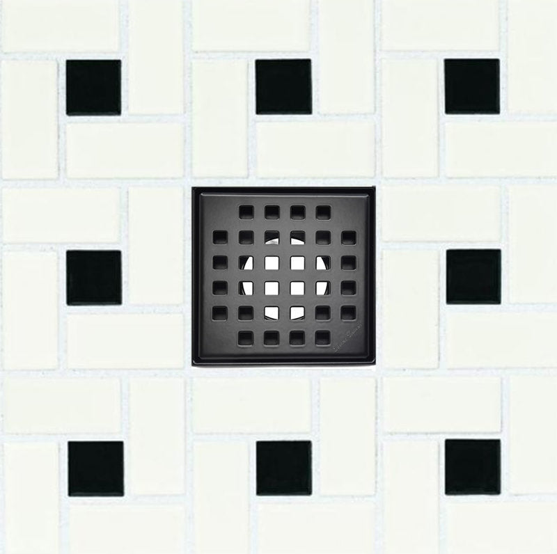 4 Inch Black Shower Drain, Traditional Square Design, Drain Installation Kit with Hair Trap and Base Flange by SereneDrains