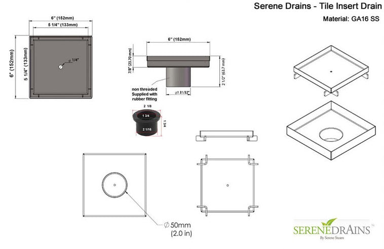 6 Inch Square Tileable Shower Drain with Hair Strainer and Drain Flange
