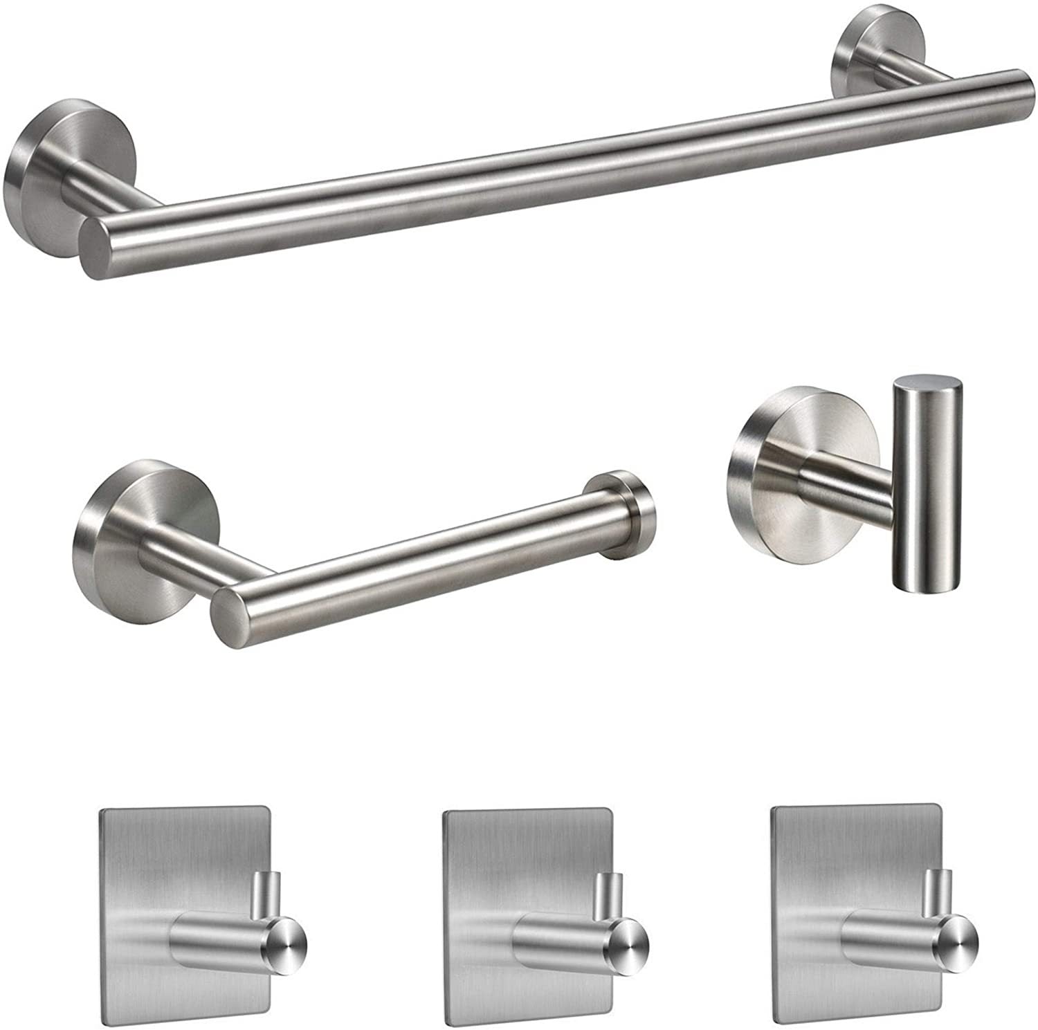 Stylish black finish wall mount stainless steel shower accessories set, thoughtfully designed for easy installation with adhesive backing. This comprehensive set includes a 16-inch towel bar, offering ample space for your towels without the need for drilling. the toilet paper holder and towel hooks also feature convenient adhesive attachments, ensuring a secure and hassle-free setup. the robe hook provides an elegant solution for keeping your robes within arm's reach. crafted from high-quality stainless steel, this accessory set combines contemporary style with practicality, allowing you to effortlessly enhance your bathroom without the need for traditional hardware installation. upgrade your space with this chic and adhesive-friendly ensemble, turning your bathroom into a stylish and organized retreat.