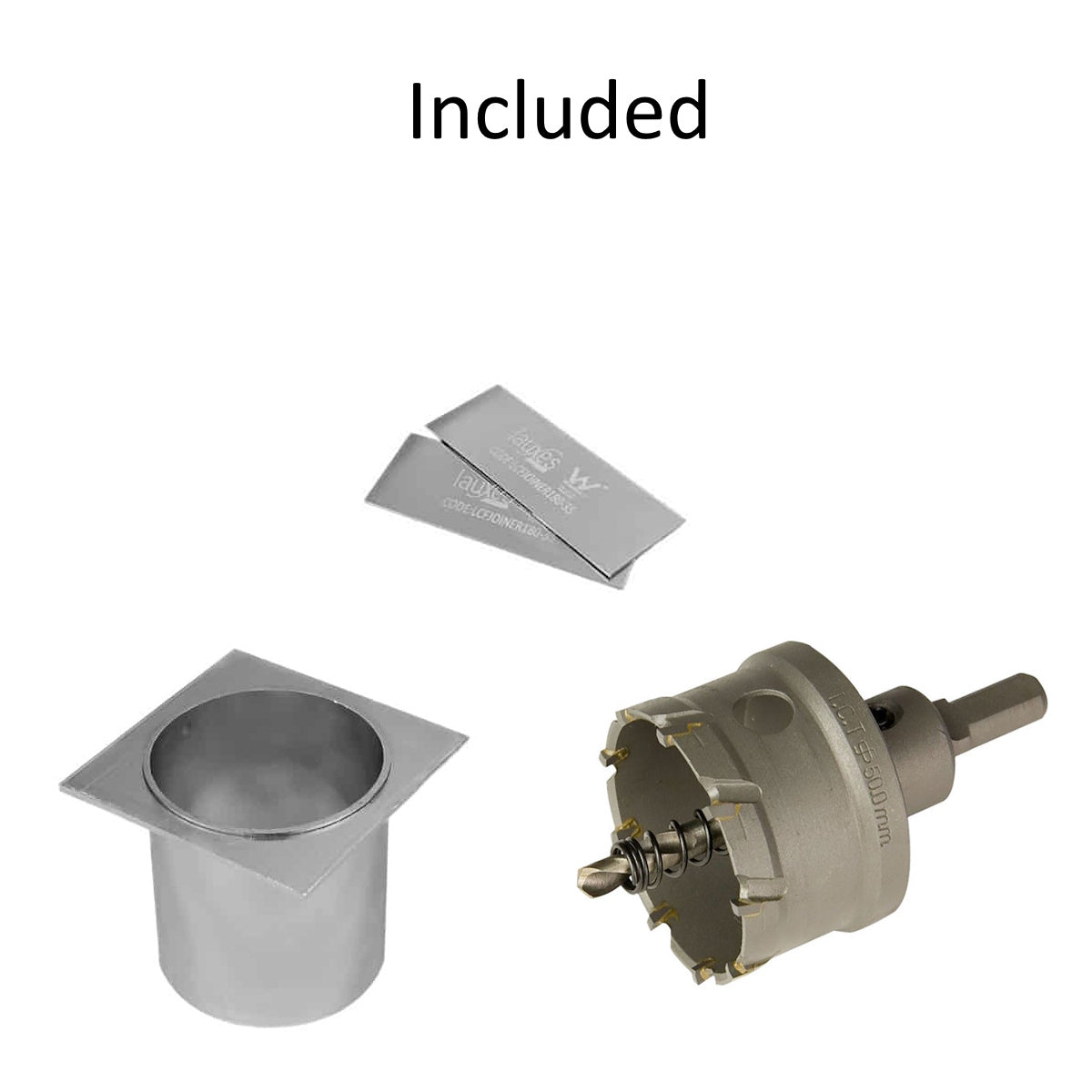 For cutting, we recommend using a compound miter saw fitted with a multi-material cutting blade (80 teeth or more). We also recommend using a Custom TCT hole saw to drill the hole for the waste outlet.