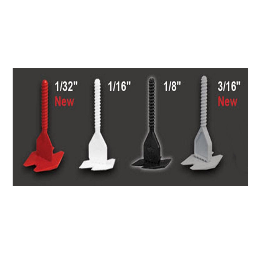 Achieve professional-grade tile installations with the Spin Doctor Tile Leveling System, available in four spacer post sizes: 1/16" (White), 1/8" (Black), 3/16" (Grey), and 1/32" (Red).